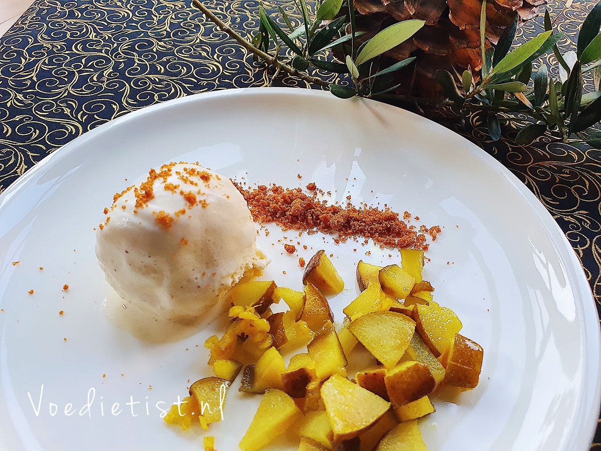 Gestoofde peertjes met gember en kurkuma, bolletje kokosijs en speculoos crumble